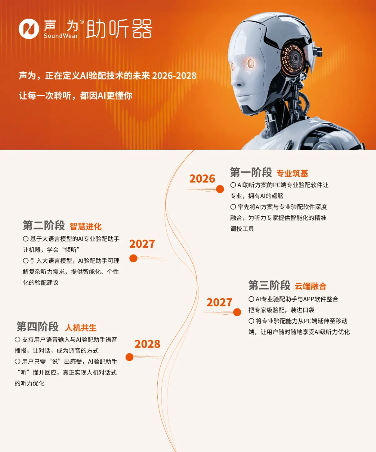 如果说产品的迭代是当下之需,那么技术的航标则决定了产业的未来。在CMEF现场,声为首次完整发布了2026-2028年AI验配技术四阶段路线图,引发了行业的深度热议。